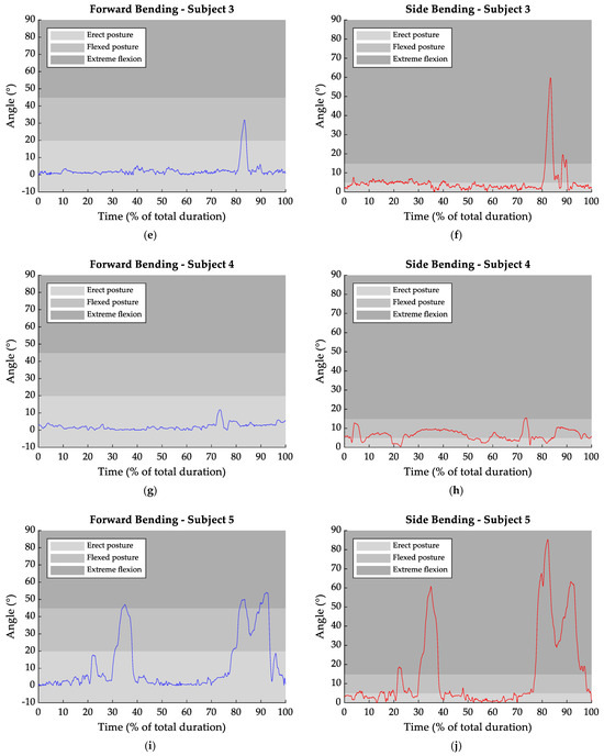 Specifically, Figure 3 and Table 3 indicate that subjects 1, 2, and 4 kept the erect posture all along the entire task duration. Whereas, if subject 3 assumed a flexed posture only for 2.06% of the task duration, subject 5 spent 14.53% in a flexed posture and 7.62% in the extreme flexion configuration.