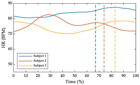 Heart rate (HR) over the task time percentage duration. The dashed lines represent the hazardous event occurrence.