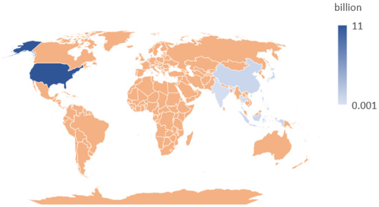 Termites are small, socially organized insects that live in colonies, and their activities pose a serious threat to infrastructure and property worldwide [4,5,6,7]. Studies show that subterranean termites account for approximately 80% of termite-related damage, with global economic losses as high as USD 50 billion [8,9]. Countries with the most severe termite-related losses are identified in Figure 1. In southern China, approximately 90% of embankments and reservoirs suffer annual damage from termites, resulting in economic losses exceeding USD 1 billion, with Indonesia experiencing comparable levels of damage. In India, termite-related damages amount to approximately USD 35.12 million each year. Japan spends between USD 800 million and 1 billion annually on termite prevention and control. In the United States, economic losses reach up to USD 11 billion, with termite-induced property damage in some areas surpassing the combined impact of storms and fires.