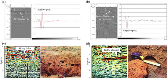 The application of GPR in the detection of termites. (a) The air-filled cavity profile detected by GPR of 900 MHz antenna [40]. (b) The water-filled cavity or clay-filled cavity profile detected by GPR of 900 MHz antenna [40]. (c) GPR images of termite group holes and verification obtained with a 500 MHz antenna [2]. (d) GPR images for termite traffic channel and verification obtained with a 500 MHz antenna [2].
