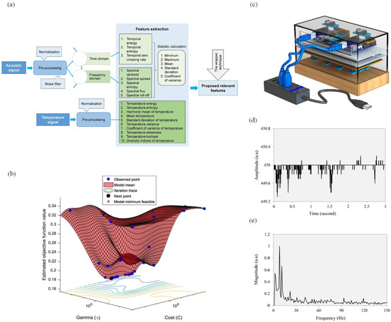 Acoustic-based detection techniques. (a) Detection flowchart [31]. (b) Optimal pairing selection [63]. (c) Detection equipment based on acoustic and temperature signals [31]. (d) Time-domain features [59]. (e) Frequency-domain features [59].