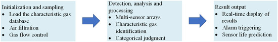 The operating process is illustrated in Figure 6, encompassing the entire procedure from sampling to data analysis and report generation. In an experimental study, Wilson et al. [35] employed the Aromascan A32S e-nose—comprising 21 chemical sensors—to investigate the odor signatures of four subterranean termite species. Their findings demonstrated that the system could effectively discriminate between species-specific VOC profiles, supporting its potential for species-level identification in termite monitoring. The application of e-nose systems in embankment environments offers several advantages. Most notably, they enable real-time, non-destructive detection of termite-related gas emissions, thereby reducing physical disruption to embankment structures. When integrated with artificial intelligence-based pattern recognition algorithms, such systems can achieve higher classification accuracy and robustness under variable field conditions.