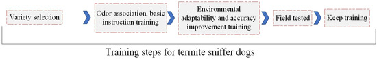 Sniffer dogs have been widely applied in the detection of various insect species, including termites, owing to their highly sensitive olfactory capabilities [85,86]. Multiple studies have demonstrated that trained dogs, across different breeds, can achieve high detection efficiency in entomological surveys [87,88,89,90,91]. As illustrated in Figure 7, the training process typically involves systematic stages, including breed selection, specialized training, and performance evaluation, each requiring substantial time and resources.