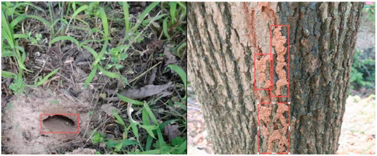 In embankment termite detection using visual inspection, attention should be focused on surface traces left by termite activity, such as termite mounds, swarming holes, and mud tubes, as shown in Figure 8. This method requires inspectors to possess substantial experience and professional judgment to accurately identify various forms of termite activity. During nest construction, termites reassemble soil particles using saliva and excreta, forming structurally stable mounds [77]. This process often increases the concealment of the surrounding environment, making detection more difficult. Therefore, in practice, thorough inspections of the embankment surface and key areas such as the platform and toe of the embankment are necessary to assess the distribution density of termite mounds and evaluate infestation severity [26,97].
