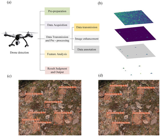 In the application of image recognition algorithms, both machine learning and deep learning algorithms have been widely adopted to make the image analysis process more efficient and accurate [43]. Sandino et al. [107] developed an automated termite mound detection method by integrating UAV-based hyperspectral imaging, support vector machine classification, and shape-based feature analysis, achieving efficient identification and localization of termite mounds with an overall accuracy of 68%. Wang et al. [96] developed an improved one-stage object detection algorithm called ACP-YOLOv5s. This model integrates an adaptive color perception module to optimize performance in complex natural environments by effectively enhancing feature extraction and color perception capabilities. The comparison results are shown in Figure 10c,d, demonstrating a significant improvement in accuracy. Zhang et al. [108] developed an improved UAV small object detection approach based on the YOLOv8 algorithm, which resulted in notable improvements in detection performance, with increases of 17.2%, 10.5%, and 16.2% in mean average precision, precision, and recall, respectively.