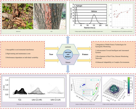 Acoustic sensing is equally susceptible to ambient interference. Studies by Tejera-Berengue et al. revealed that wind speed, terrain clutter, and UAV distance introduce considerable noise into acoustic data, reducing classification accuracy. These challenges are especially relevant when attempting to detect termite feeding or movement signatures near vegetated embankment surfaces [112,113]. Controlled deployment windows and directional microphones have been proposed to mitigate such limitations [114]. Chemical sensors, such as electronic noses for detecting termite-emitted VOCs, are heavily affected by microclimatic shifts. Elevated temperature and humidity accelerate gas dispersion, compromising detection specificity. A multi-scenario model proposed by Qu et al. applies adaptive calibration to improve sensor stability across variable field conditions [115].