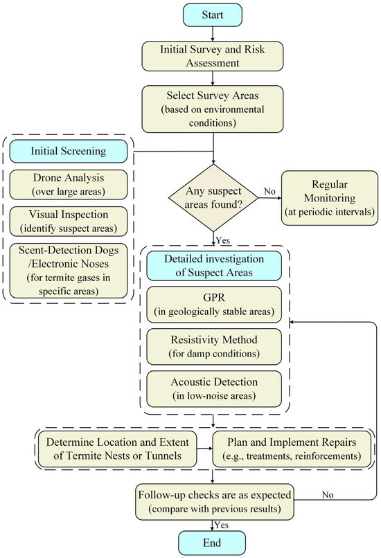 In summary, termite detection systems must be tailored to site-specific environmental conditions. By integrating multi-sensor detection technologies, such as combining UAV imagery with GPR or acoustic sensing, the limitations of each modality can be offset, resulting in more accurate and robust monitoring results for embankment infrastructure. Meanwhile, improvements in both the materials and overall performance of key equipment can more effectively mitigate uncertainties caused by environmental factors, thereby enhancing the accuracy and reliability of detection in future applications [84,119,120]. Figure 12 gives an implementation roadmap that integrates multi-sensor detection methods, covering the process from survey assessment to follow-up inspection.