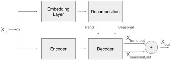 https://github.com/thuml/Autoformer, accessed on 20 May 2024). We used one encoder and two decoder blocks, with the aim of adding more processing power and depth to our network. At the same time, using the input sequence again before the decoder blocks acts as a residual connection. We use the network in a non-autoregressive fashion. That is, there is no left-to-right processing as is usual with the decoder part of a transformer, but rather the sequence is processed bidirectionally in both encoder and decoder blocks. An overview of the architecture is shown in