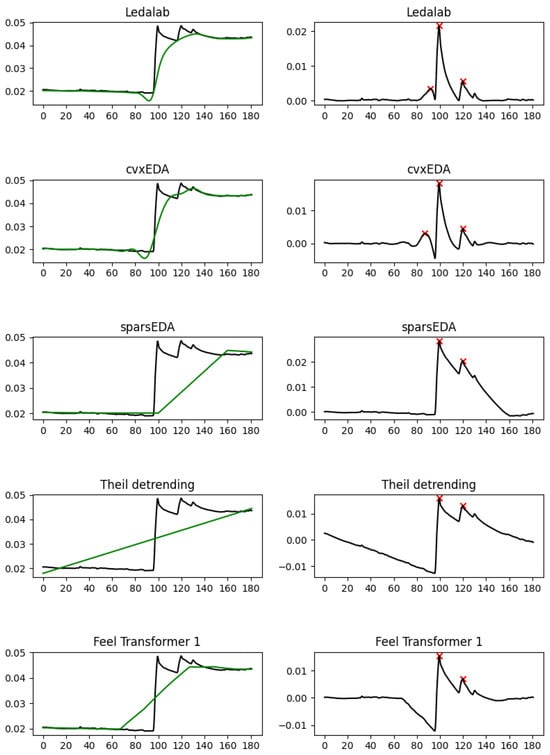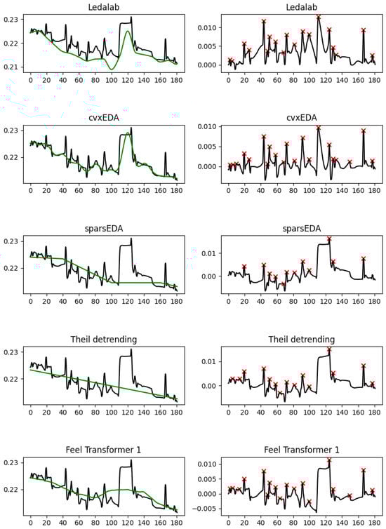 Section 5.1). The visual inspection of characteristic frames reveals that the cubic interpolation used by Ledalab and cvxLeda creates non-existent peaks when the EDA signal has abrupt changes. Such changes are rare in laboratory conditions, where datasets are usually acquired, but are a lot more common in personal healthcare and well-being applications that rely on the EDA signal acquired in the wild from wearable devices. It should also be noted that laboratory studies validate methods by observing signal segments that are known to contain ANS responses because such responses have been explicitly elicited by stimuli. However, such approaches cannot validate the tonic component since their limited duration cannot contain meaningful SCL changes. Based on the above, we observe that the agreement of the Feel Transformer with domain-specific methods on the SCR features is a positive indication for the validity of our method; the minor disagreement between the Feel Transformer and domain-specific methods on the SCL should not be taken into account since the performance of domain-specific methods on the SCL features has not been validated.