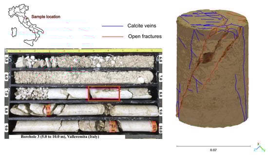 Location and features of the analyzed core fragment. (Left) Core box with the selected sample highlighted in red (Valleremita, Marche Region, Italy). (Right) A 3D model of the sample showing open fractures (red) and calcite veins (blue).
