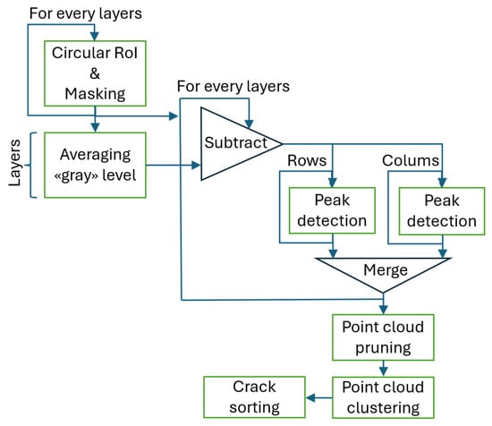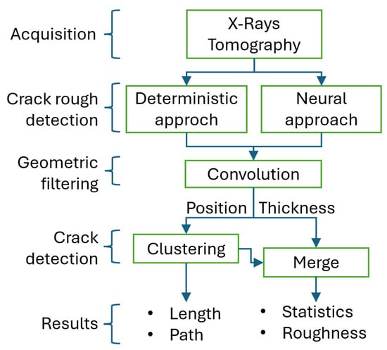 The specimens analyzed in this study were defined as cylindrical in shape. They were positioned in the tomograph with the main axis of the cylinder oriented in the vertical direction. This configuration represents an anomaly concerning the best practices of tomographic measurement, where installation under symmetrical conditions is typically not recommended. This is due to the risk that the real symmetries present in the object may be confused with the potential symmetries induced by the tomographic algorithm. In this instance, however, the focus of the analysis was directed toward the cracks, which did not exhibit such symmetry. Positioning the cylinder along the vertical axis facilitated the reading and processing of the results. The completed flowchart is shown in Figure 5.