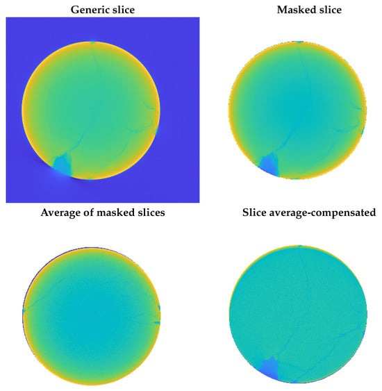 For each individual layer, the circular section of the specimen enabled masking and the accurate alignment of each layer. From these aligned layers, the average image was subsequently derived, representing the density distribution within the specimen, particularly along the radial direction. Analysis of the tomography results revealed variations in density, primarily attributed to three factors: