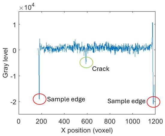For each individual layer, the density distribution was examined along the rows and columns, yielding one-dimensional density profiles. Peaks corresponding to minimum density values associated with the presence of air within the cracks were identified along these profiles. Despite the normalization performed on the density profiles, the presence of measurement noise suggested a need for the introduction of a convolutional algorithm for peak detection related to the cracks.