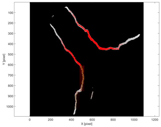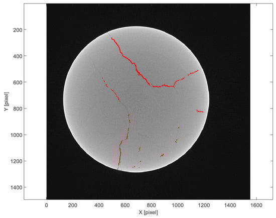 Figure 9 presents the same masked tomographic slice shown in Figure 8, now overlaid with the extracted fracture points (in red). The underlying image retains grayscale information only within the predicted ROI, while all other regions are suppressed. This combined representation allows for a direct comparison between the U-Net segmentation and the outcome of the intensity-based fracture detection, supporting the evaluation of the method’s capability to capture fracture geometry. Despite the spatial constraint imposed by the U-Net masks, the use of intensity thresholding introduced certain limitations. Background noise in the tomographic slices could lead to the inclusion of isolated non-fracture pixels among the detected points. This ambiguity was particularly relevant in regions where the contrast between fractures and the surrounding matrix was low. A trade-off was therefore necessary: lowering the threshold increased the risk of false positives, while raising it could result in the omission of relevant fracture details. The selected threshold was chosen to balance the minimization of false detections with the preservation of the fracture network’s continuity.