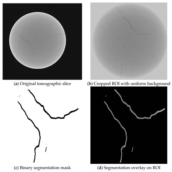 To overcome these limitations, recent studies have increasingly focused on machine learning approaches, which offer improved segmentation accuracy and robustness with minimal user intervention. Supervised methods, such as convolutional neural networks and, more specifically, U-Net architectures [] have demonstrated superior performance in segmenting fine and elongated features from X-ray CT data owing to their hierarchical feature extraction and spatial encoding–decoding capabilities.