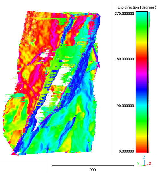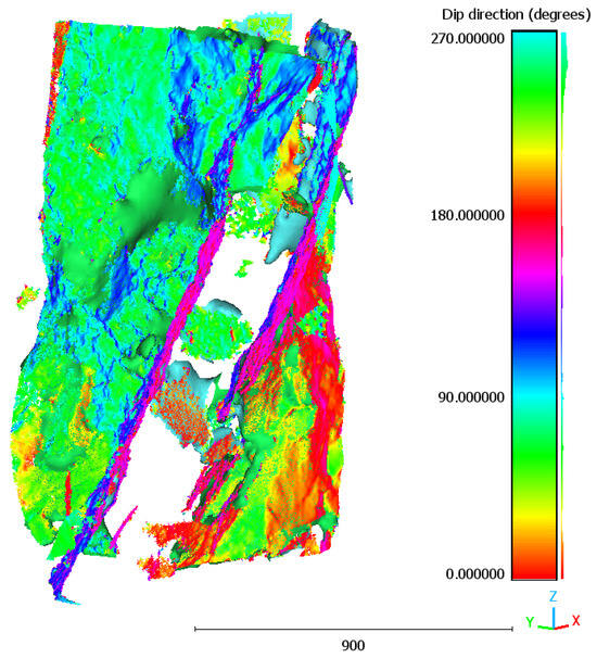 In terms of practical applications, our methodology is well-suited for geological and geotechnical tasks such as fault characterization, reservoir evaluation, and stability analysis in rock mechanics, as reported by many authors [,,]. Matlab algorithms are computationally efficient, easily reproducible, and inexpensive, making them accessible for rapid analyses by other researchers, accelerating the analysis and characterization of fracture networks that can be directly used for modeling purposes []. However, it remains essential to validate the results with field data or classical measurements performed on the samples, as emphasized by Mammoliti et al. [].