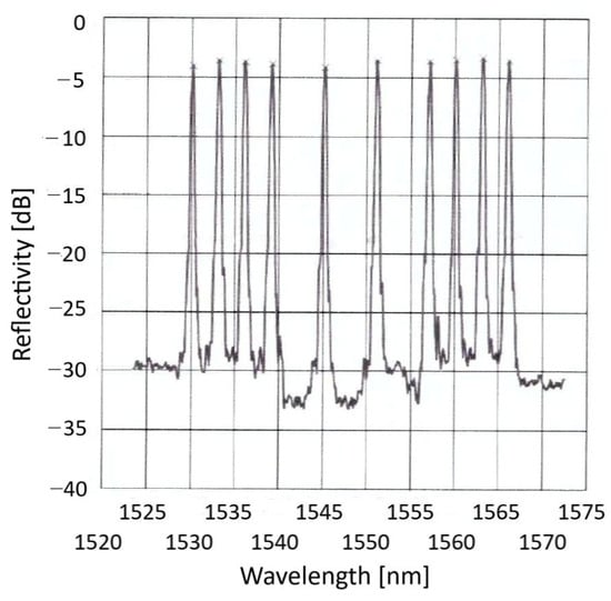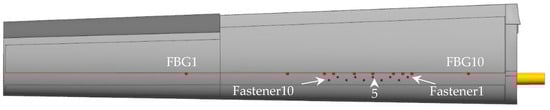 A polyimide-coated (ϕ145 μm) optical fiber sensing array, having 10 fiber Bragg gratings (FBGs) inscribed along its length, was placed parallel to the fastener line and securely attached to the skin surface using a structural adhesive, as shown in Figure 3 (this work, boasting real-time operation, could not use distributed fiber-optic sensing (DFOS), mainly due to the large amount of data generated over meters of fiber at the required sampling speed). The spectra of the array of FBGs, Figure 5, indicate quite uniform reflectivities of more than 35% at 1530, 1533, 1536, 1539, 1545, 1551, 1557, 1560, 1563 and 1566 nm (within −0 + 0.06 nm). Bandwidths at −3 dB were 0.383 ± 0.008 nm, and sideload suppression was better than 15 dB. The fiber array was glued to the thoroughly cleaned wing surface and then mechanically protected by a cured 3 cm wide and 0.1 mm thick layer of epoxy resin-impregnated glass fiber fabric. Seven FBGs were spaced along the damage zone and three outside, for reference. A well-secured egress point leads a 3 mm fiber cable through the wind tunnel floor to a commercial dynamic FBG interrogator.