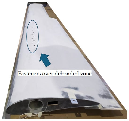 For the SHM system demonstration, a production-standard composite outer-wing segment measuring 2.3 m in length was selected as the test specimen. The damage scenario involved an adjustable debond introduced at a predetermined interface location, to be described below. The growing prevalence of composite structures in aerospace applications stems in part from the manufacturing efficiency and weight savings afforded by adhesive bonding, which increasingly supplants conventional mechanical fastening. Nonetheless, debonding remains a critical failure mode. Its early-stage development perturbs the local strain distribution, making it amenable to early detection via a fiber Bragg grating (FBG) sensor network either surface-mounted on the structure or integrated within it.
