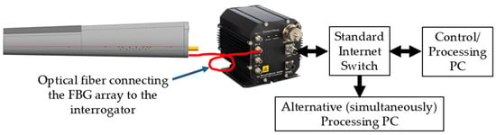 The data acquisition setup included the FBG interrogator, an internet switch, a Control and Processing PC and another computer that simultaneously received the FBG data broadcast by the interrogator, allowing it to process the data in ways different from those of the other computer (not used in this work).