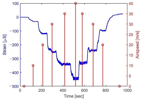 Each experiment started by setting the strains of all FBGs to zero. Figure 8 shows the strain in a typical tunnel run, together with the airspeed at the center of each step. At an attack angle of 4 degrees, all FBGs were under compression during the run. Note, though, the positive strain readings at the end of the run (~24 μS), indicating a temperature effect. Indeed, in this experiment, the temperature started at 30° Celsius, increasing to 35.7° at the maximum airspeed of 41.8 m/s, ending at 34°. Assuming the wing to straighten up elastically at the end of the run to its run-start position, we can roughly estimate the dependence of the FBG readings on temperature as 6 μS/°C (=24/4), close enough to the known values for FBGs glued to the surface of composites [,].