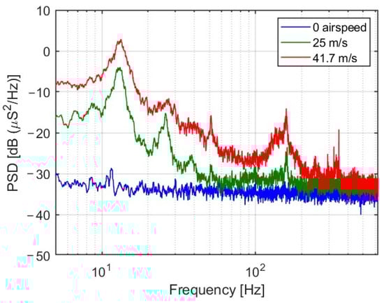 Power spectral densities of the strain readings of FBG 8 for a healthy wing, Case 1, calculated from segments of constant airspeed at zero airspeed (bottom, blue), 25 m/s (middle, green) and 41.7 m/s (top, red), all taken at 1250 samples/s. Note the weaker harmonics, clearly visible in the middle, green trace. The sources of the significantly weaker events at frequencies above approximately 100 Hz have yet to be identified.