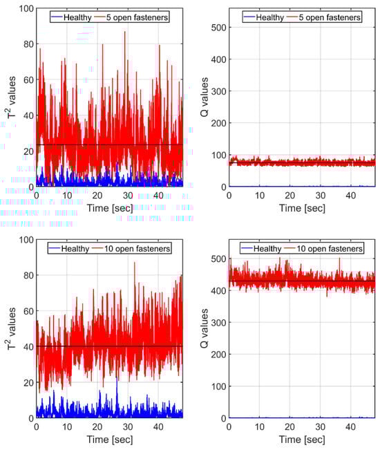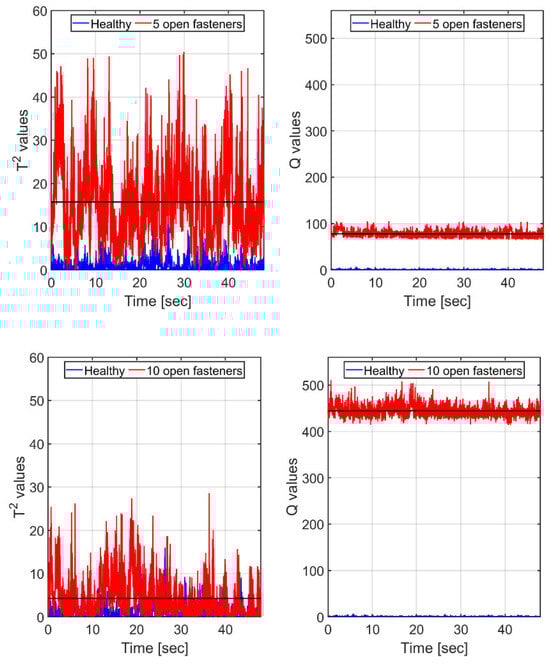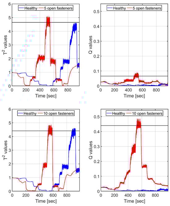 With real-time SHM damage detection applications in mind, a possible scenario may involve continuous (or intermittent) comparisons of segments of current readings of the sensing net with stored values of the healthy states of the vehicle under the same flight conditions. We thus isolated segments of equal speed of approximately equal durations and subjected the strain traces (compensated for small differences in temperature and airspeed) to and tests. Case 1 (serving as the healthy/reference state) and its 10 FBGs’ readings in the segment of max speed (41.8 m/s) were used to establish the reference PCA model, following the procedure outlined in Section 5.1. Since the largest eigenvalue of the covariance matrix represented 91% of the total variance, scores based on the leading principal component were subjected to and analyses, resulting in Figure 10 (5 fasteners open, Case 2) and 8 (10 fasteners open, Case 3). Note that in each case we also show (bottom, blue) the and values of the healthy case against itself.