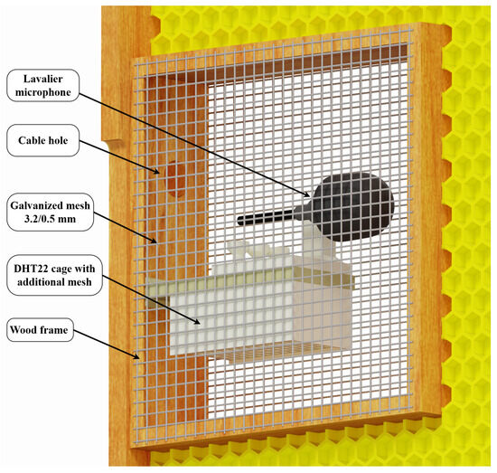 Due to the dangers of propolization and beeswax buildup on measurement instruments as well as to limit the stress of a foreign body being present within the beehive, a specialized protective cage was developed to achieve successful mounting on the inside of the beehive. The protective cage consisted of a wood enclosure mounted in the middle of a brood frame protected on both sides of the frame with a high-density galvanized mesh with a mesh size of 3.2 mm and a wire diameter of 0.5 mm. Within the enclosure, as shown in Figure 1, a 3D printed microphone mount was implemented to keep the microphone as close to the geometric center of the enclosure as possible, with a vertical pin used to mount the clip of the Lavalier microphone and three tension relievers to keep the microphone in place during mounting. The final location of the internal microphone enclosure, shown in Figure 2 and Figure 3, was chosen in order to minimize the impact of measurement devices on the beehive. The modified brood frame containing the protective enclosure was placed into the beehive with the measurement device on the side of the frame furthest from the entry to the hive.