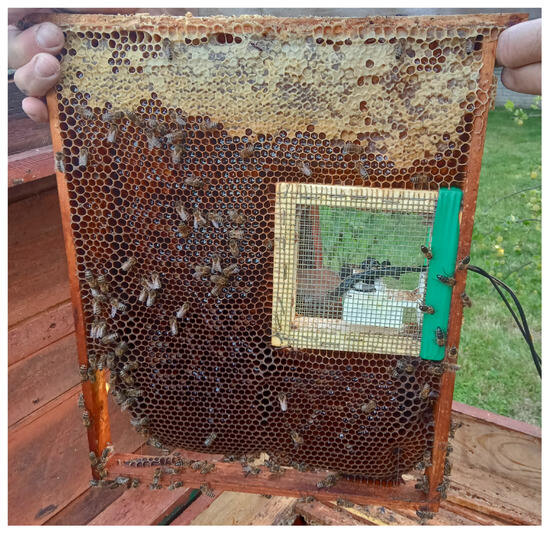 Internal microphone location after mounting the frame within the beehive. Photograph taken at the start of measurements; capped brood can be seen beside the setup.