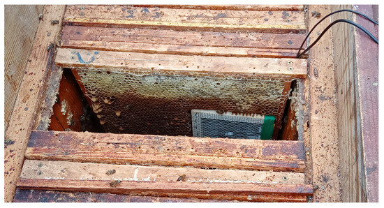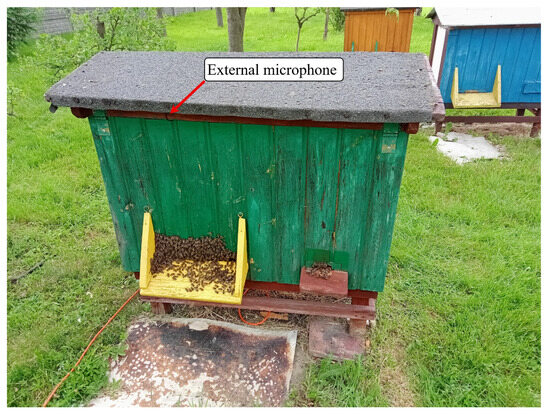 The external microphone required no specialized enclosures and was attached to the outside wall of the beehive above the beehive entry using mounting tape. It was protected from rain and environmental factors by the beehive’s roof overhang. The location of the external microphone is shown in Figure 4.