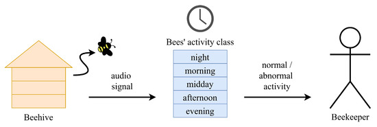 This work is performed in the context of establishing methods for evaluating the state of the honey bee colony to locate anomalous behavior using an automated monitoring system. A monitoring system may use the methods proposed in this work, which are trained on sounds produced by a healthy bee colony, in order to evaluate the state of a given bee colony and detect anomalies based on the error rate of the classification method. Anomalous behavior of honey bees would be a clear indicator of some environmental factors or problems with the colony health. A conceptual system utilizing the methods tested in this work is presented in Figure 5.