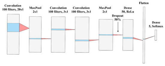 A deep learning convolutional network was designed with five-way classification in mind. The network architecture, shown in Figure 6, consists of an input layer, three 2D convolutional layers, two max pooling layers, one dropout layer, and two fully connected layers. The designed output of the network is a five-value vector containing probabilities of the sample under test belonging to every time-of-day category associated with a class listed in Table 1. Four instances of the network were created, each corresponding to a different feature-location combination. All network instances were trained on an NVIDIA RTX 3060 graphics card using the Keras library with a TensorFlow backend. The networks were trained for 15 epochs with a batch size of 128 recordings. The optimization algorithm used in the training was the Adam algorithm. The cost function used was categorical cross-entropy, and the objective function was weighted classification accuracy.