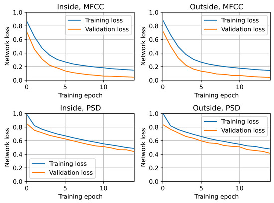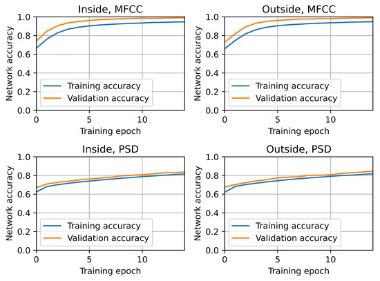 Classification accuracy results acquired by analyzing data in both microphone locations (internal and external) achieved by the CNNs do not differ visibly, as presented in Table 2 and Table 3. A very high accuracy result was achieved by training the convolutional network on MFCCs of recordings taken both outside and inside the beehive. Results achieved by CNNs when classifying the Power Spectral Density of signals are visibly worse than those achieved when using MFCCs; however, the similarity of results achieved by recordings in different locations is preserved. Results achieved via analysis of MFCCs are on par with those shown in the literature, albeit with a different method of analysis [24].