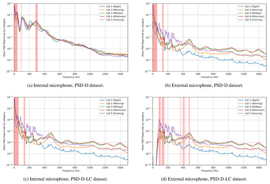 The Extra Trees importance metric was extracted using the Mean Decrease Impurity method and sorted in decreasing order. Figure 9 shows the categorically divided mean characteristic values, with highlighted lines showing the ten frequencies with the highest MDI score. It can be seen that in the PSD and PSD-D datasets, the most important frequencies for classification are very low. In the case of PSD-D-LC, the most important frequencies are shifted upward to bands around 110–150 Hz, as well as 280–320 Hz for internal sound recordings and around 80–150 Hz and 350–500 Hz for external classification.