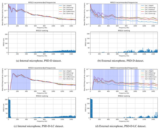 The RFECV scores and recommendations are presented in Figure 10. The top subplot highlights the selected frequencies in blue, with the ranking of each frequency shown in the bar plot below. Lower ranks assigned by the method mean that the feature is more important to the classification. It can be noted that the results broadly replicate the behavior seen in the MDI scores. The RFECV method recommends frequencies in the same bands as the Random Forest model for equivalent datasets. In the PSD-D-LC dataset, the rank for frequencies below 75 Hz is very high, which is expected due to the low-cut filtering of the audio signal.