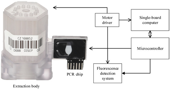 Diagram of the proposed system. The target microfluidic cartridge consists of an extraction body and PCR chip (left). A block diagram of the control system is shown on the right.