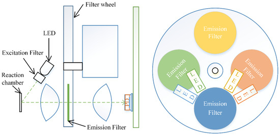 Figure 2 illustrates the fluorescence detection system, which employs four pairs of light-excitation filters and emitting diodes (LEDs) positioned at a 45° angle near the PCR chip. The PCR chip is illuminated by the emitted LED light passing through the excitation filter and is captured through an emission filter mounted on a custom-designed rotating filter wheel. A set of four matched excitation and emission filter pairs was sourced from Chroma Technology Corporation (Bellows Falls, VT, USA) for multi-channel fluorescence detection. The excitation LEDs and photodiodes were purchased from Digi-Key Electronics (Thief River Falls, MN, USA). This 4-channel configuration enables simultaneous detection of up to three distinct fluorescence-labeled targets plus an internal control, supporting triplex pathogen detection in a single reaction chamber.