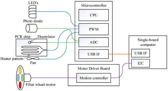 Figure 3 provides an overview of the integration of a sensor–actuator with the MCU. The photodiode and thermistor are connected to the analog-to-digital converter (ADC) of the MCU, while LEDs, heater pattern, and cooling fan are controlled via pulse-width modulation (PWM). The MCU communicates with the SBC through a USB interface, ensuring efficient data exchange. To maintain consistent fluorescence measurements, the MCU directly regulates LED activation and temperature control. A proportional-integral-derivative (PID) control algorithm is implemented to precisely regulate temperature by driving the heater pattern based on real-time resistance values obtained from the thermistor.