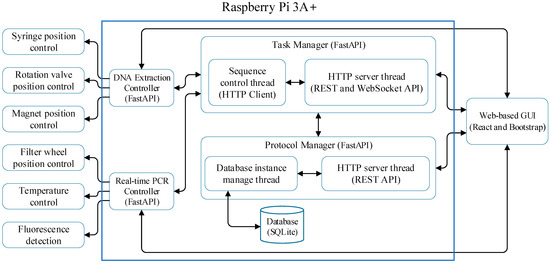 This study proposes an advanced system architecture for a fully automated POC-MD device, incorporating recent IT advancements. Unlike conventional hierarchical architectures, our approach employs a distributed system design with interconnected functionalities, enabling remote monitoring and control via networked communication. The system leverages an optimized application programming interface (API) protocol to ensure efficient real-time operation and integrates a web-based GUI for enhanced user interaction [37,38]. Additionally, the core functions of DNA extraction and real-time PCR are structured as independent modules, allowing for autonomous operation and improved diagnostic performance. Furthermore, the core functions of DNA extraction and real-time PCR are modularized as independently operable units, each accessible via a dedicated Web interface. This structure facilitates separate testing and debugging of each biochemical step, enhancing development efficiency, reliability, and maintainability.