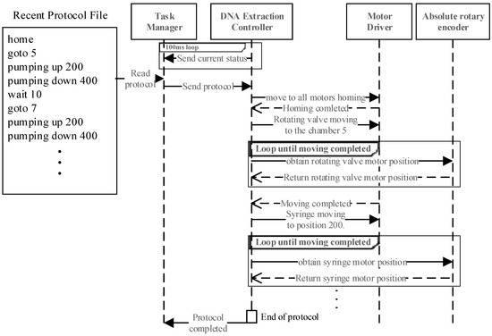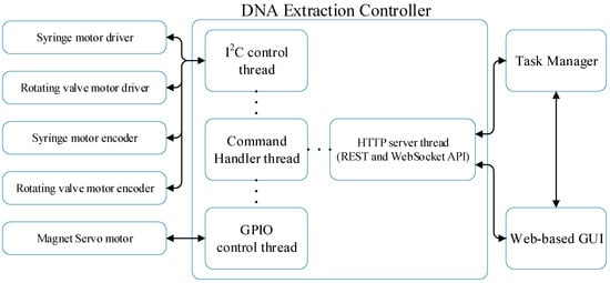 The interaction diagram of the DNA extraction controller is shown in Figure 6. It consists of an HTTP server thread, a command handler thread for parsing high-level commands into executable actions, an I2C control thread for stepper motor management, and a GPIO control thread for magnet servo motor control. The controller communicates with the task manager via WebSocket API for periodic status updates.