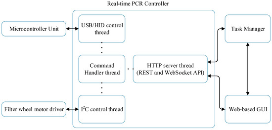 Figure 7 depicts the interaction diagram of the real-time PCR controller, which comprises an HTTP server thread, a command handler thread, a USB/HID control thread for MCU communication, and an I2C control thread for filter wheel control. The PCR chip temperature is regulated using the USB/HID thread, controlling heater patterns, thermistors, and fans. Fluorescence detection is performed by managing LEDs and photodiodes through USB/HID, while filter wheels are controlled via I2C.