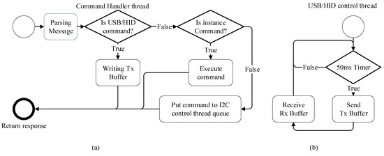 Real-time PCR controller flowchart: (a) command handler thread and (b) USB/HID control thread.