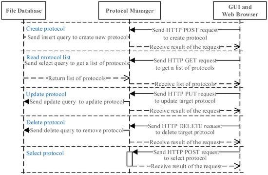 Figure 9 shows the sequence diagram of the protocol manager, which handles HTTP requests for protocol retrieval, storage, modification, and deletion. Protocol selection triggers a “Select protocol” request, generating a binary file (“recent protocol”), which is accessed by the task manager for execution.