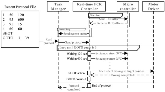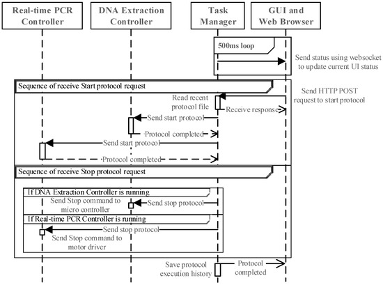 Figure 10 outlines the process for initiating or terminating a protocol. The task manager updates the web-based GUI at 500 ms intervals via WebSocket. When execution begins, the task manager retrieves the DNA extraction protocol and sends it to the DNA extraction controller. Upon completion, the real-time PCR protocol is similarly executed. If a stop request is received, the appropriate controller is instructed to halt its operation. The final execution results are stored in the database for future reference.