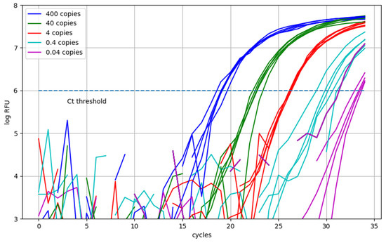 Figure 13 presents the real-time amplification curves obtained from five replicates at each of five template concentrations, ranging from 400 to 0.04 copies per 30 µL reaction. The dashed line indicates the log RFU threshold of 6, which was empirically determined as the optimal threshold minimizing the average Ct variability across all concentrations.