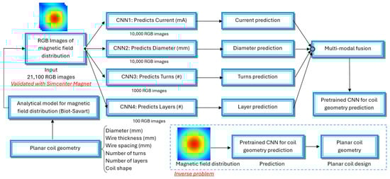 A total of 21,100 RGB images make up the workflow input, which shows magnetic field distributions produced by planar coils. The analytical model based on the Biot–Savart law produces synthesized images to determine planar coil magnetic field distributions. The geometry parameters are