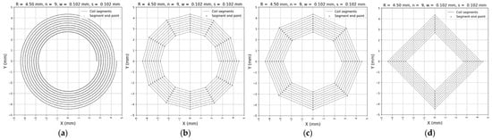 Comparison of spiral coil discretization at different angular resolutions: (a) 1 degree per coil point; (b) 30 degrees per coil point; (c) 45 degrees per coil point; (d) 90 degrees per coil point (square-shape planar coil).