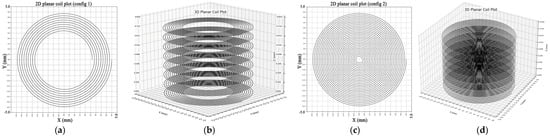 Figure 4 illustrates the spiral coil geometry represented at different levels of discretization, demonstrating how varying the number of segments affects the approximation of the coil winding. Here, represents the outer radius, the wire width, the wire spacing, and the number of turns.