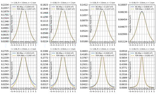 Fixed radius of 3 mm, 1 turn, and varying currents of 1 A, 0.8 A, 0.6 A, and 0.4 A.
