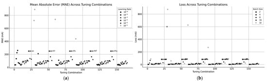 Figure 12. Results of tuning combinations: (a) MAE across tuning combinations; (b) loss variation across tuning combinations grouped by batch size. - ▪
