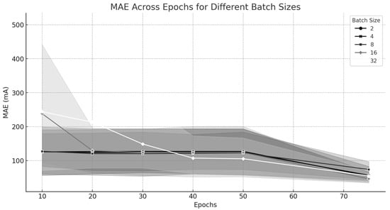 The lines in the graph represent the mean MAE for each batch size as epochs increase. The gray shaded area represents a confidence interval that indicates the stability of the model’s performance.